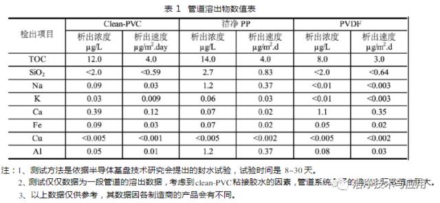 選擇管材的依據主要是管道的溶出物(見表1)及內表面光潔度。主要應用的管道有Clean-PVC管、潔凈PP管、PVDF管幾種。Clean-PVC管采用耐沖擊硬質聚氯乙烯制造,其比普通PVC管含有較少的添加劑。從而減小了管道內壁的粗糙度(Clean-PVC管的表面粗糙度小于0.37 μm,而普通PVC管的表面粗糙度在1.0 μm)以及污染物的析出。制造商主要有“積水國際貿易有限公司(SEKISUI)”、“日本旭有機材株式會社(ASAHI AV)”。潔凈PP管材質為(β)-PP-H均聚型聚丙烯,具有非常均一、致密的結構和出眾的抗沖擊強度。其高結晶度確保了極好的耐化學品性能,二氧化鈦色素的使用進一步提高了此特性。其內壁粗糙度及污染物的析出性能與Clean-PVC接近。制造商主要有喬治.費歇爾管路系統有限公司(+GF+)。PVDF管材質為聚偏二氟乙烯,是一種高結晶度,純水設備高性能熱塑性塑料,可用溫度/壓力范圍廣。其主要特性是力學強度高、韌性好、具有優異的耐磨性、熱穩定性和介電性,其純度高,能熔融成型,對于大多數化學品和溶劑都具有很好的耐腐蝕性、抗紫外線和核輻射性能好、耐候性好、耐生物菌類的作用、氣體和液體阻隔性好、阻燃性好、發煙量少等優點。聚偏二氟乙烯是一種純凈的材料,它不含任何添加劑,且其表面光滑,粗糙度小于0.2μm。制造商主要有喬治?費歇爾管路系統有限公司(+GF+)、奧地利AGRU公司。