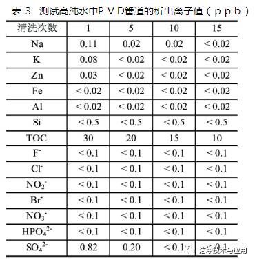 如表2所示,8英寸半導體對純水水質指標的要求相當嚴格,Clean-PVC及潔凈PP已不能滿足其要求,而PVDF管道的溶出物及管道內壁光潔度都遠強于Clean-PVC及潔凈PP,故而只能選擇PVDF管道。在國內的半導體生產中也有8英寸采用Clean-PVC管道的成功案例,但經過實測分析后發現,這類生產廠的產品都是從6英寸升級至8英寸的,也就是在6英寸純水管道系統運行若干年后升級為8英寸的,而Clean-PVC管路系統經過長時間運行后,其溶出的離子呈逐步減少的趨勢。以某電子廠為例,一期廠房純水系統未設置專門的除TOC紫外線燈,僅依靠制備過程中對TOC的去除,在運行了若干年后,其回水管道TOC可以達到15ppm,而二期新建的純水系統,設置了專用的除TOC紫外線燈,在系統開始運行階段的站房出口TOC,也只有50 ppm。正是由于這種特性,所以純水系統在投產前需經過相當長時間的沖洗運行。所以在從6英寸升級到8英寸的生產中,經過若干年沖洗的Clean-PVC管道也是有可能達到使用要求的。而PVDF管道可以在短時間內沖洗到較低的指標,如表3所示。為了節省初投資,純水回水管道可以采用Clean-PVC或者潔凈PP管代替PVDF,由于純水回水需經過拋光系統的再次處理,所以即使回水中有較多的溶出物也不影響供水的水質,只是會影響拋光系統的維護費用,但長時間運行后維護費用的差別會逐步減小。