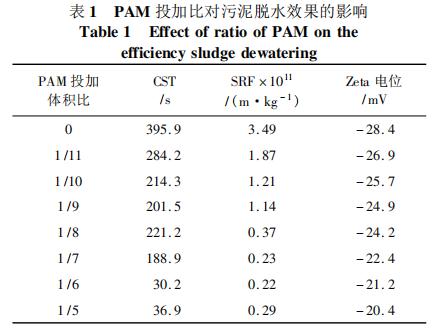 表 1 為 PAM 投加體積比對污泥脫水性能的影響,污泥體積為 200 mL。
